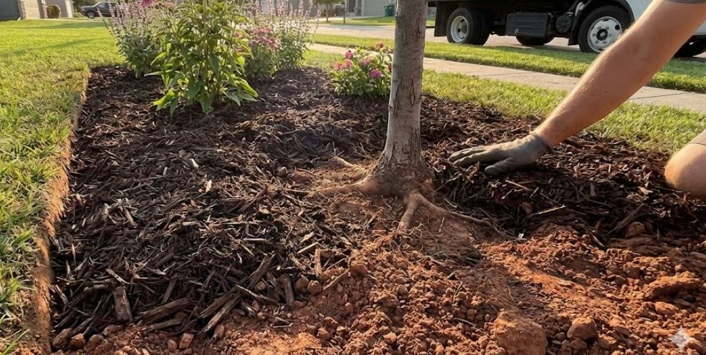 In many Wichita suburbs like Andover and Bel Aire, it is common to observe "mulch volcanoes" - large mounds of wood chips piled six to eight inches high against a tree’s base. While this might appear visually "finished" to an untrained eye, it is fundamentally a mechanical failure in landscaping. Trees possess a "root flare" where the trunk transitions into the root system. This specific area is biologically designed for gas exchange, not constant moisture. By burying this flare, the mulch traps water directly against the bark, eventually causing the phloem - the tree's nutrient transport system to rot. The professional standard is a flat, two-inch application that tapers off before it ever touches the trunk. It should resemble a donut, leaving the flare exposed to the air.